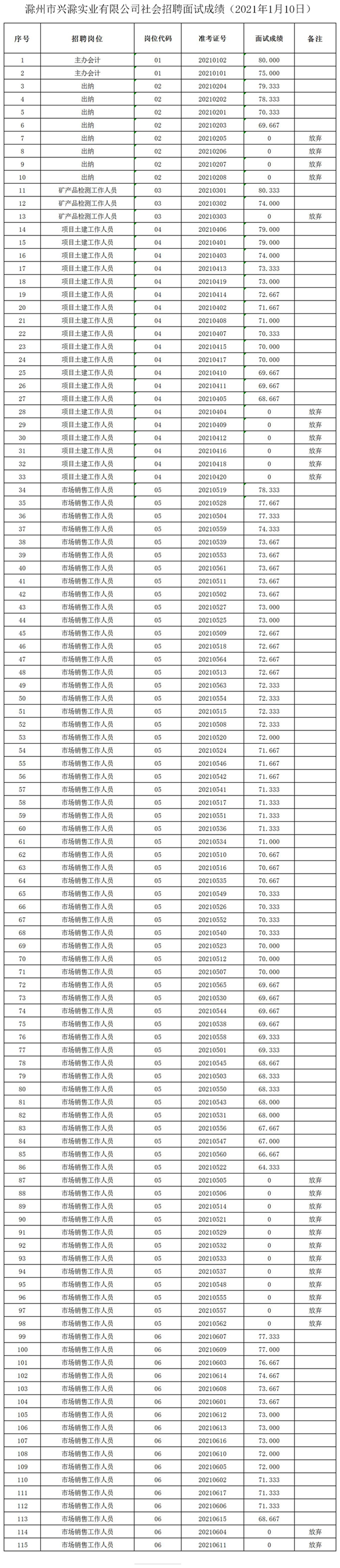 滁州市興滁實(shí)業(yè)有限公司社會(huì)招聘面試成績(jī)