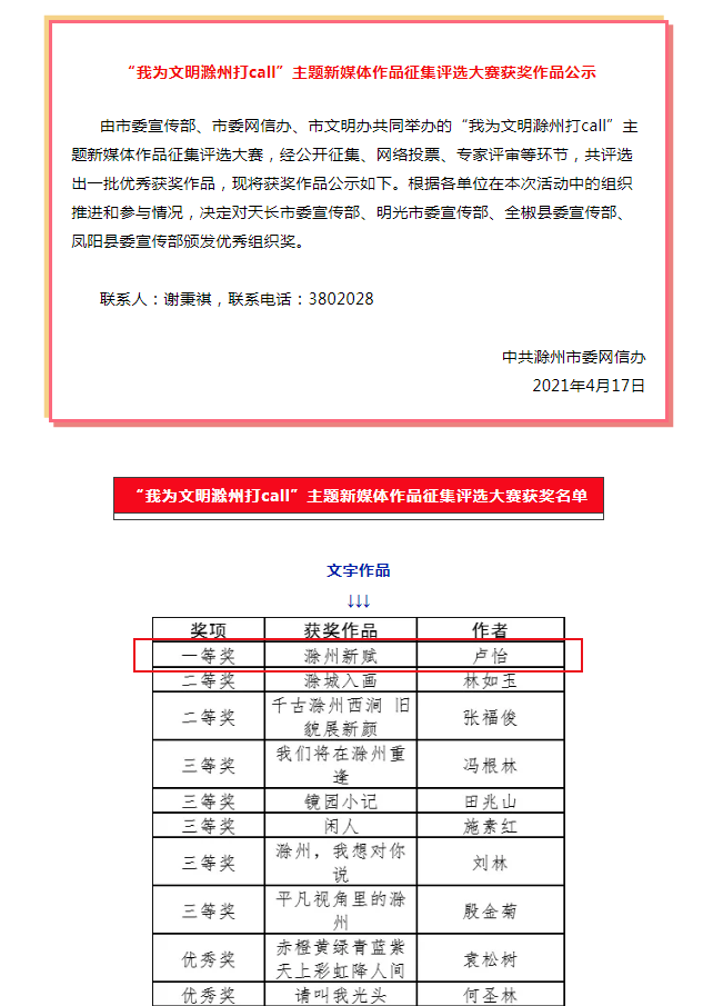 喜訊!我公司職工盧怡獲市委網(wǎng)信辦“我為文明滁州打call”主題新媒體作品征集評(píng)選大賽文字作品一等獎(jiǎng)!